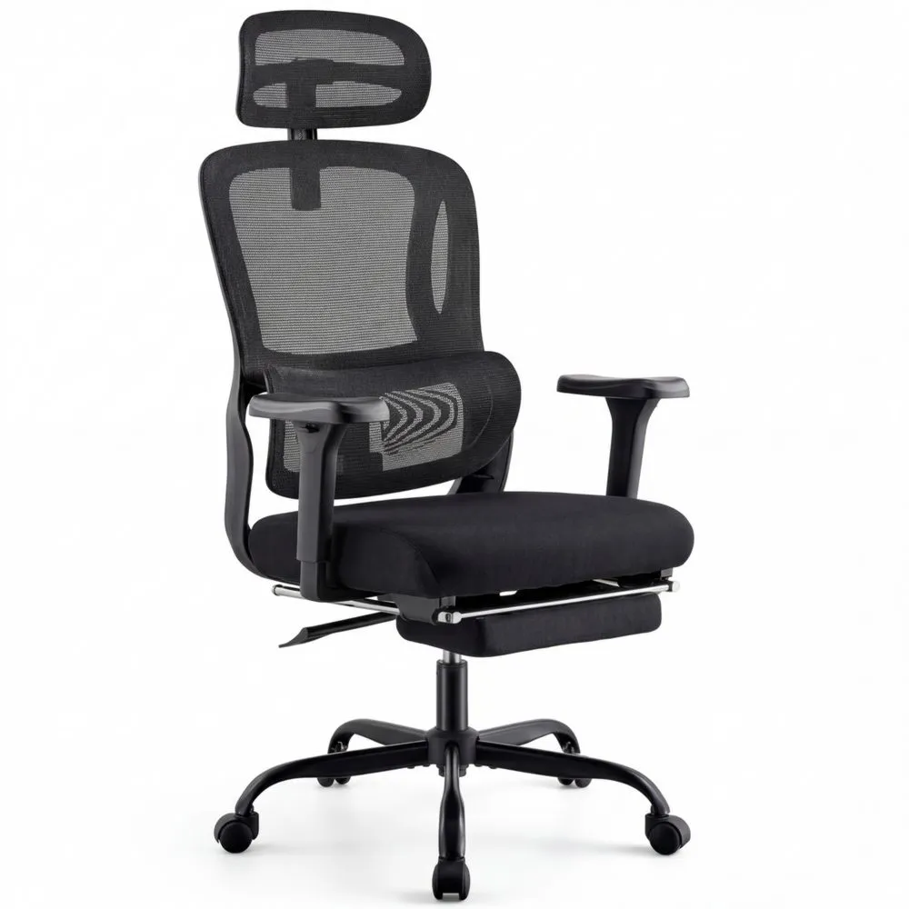 Silla de oficina con respaldo reclinable y reposabrazos ajustables en tres dimensiones. Respaldo reclinable con bloqueo en ángulos de 90, 115 y 135 grados. Diseñada para fomentar una postura saludable al sentarse. La silla incluye mecánica oscilante con tensión ajustable, soporte lumbar y reposacabezas regulable. Reposabrazos acolchados ajustables en altura, adelante y atrás, y con giro. Estructura de metal y ruedas que se deslizan fácilmente. Altura ajustable de forma continua y rotación de 360 grados. Soporta hasta 150 kg. Reposapiés cómodo guardado debajo del asiento, fácil de liberar al reclinarse. Asiento, respaldo y reposapiés acolchados. Diseño moderno y sencillo que se adapta a cualquier oficina o estudio.